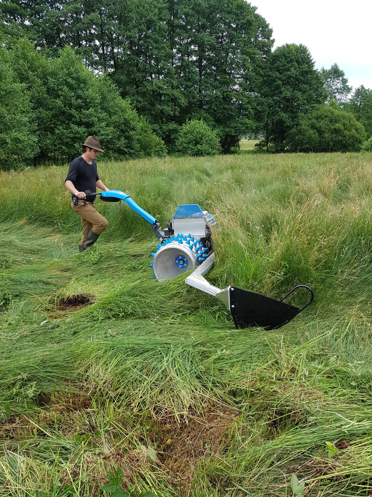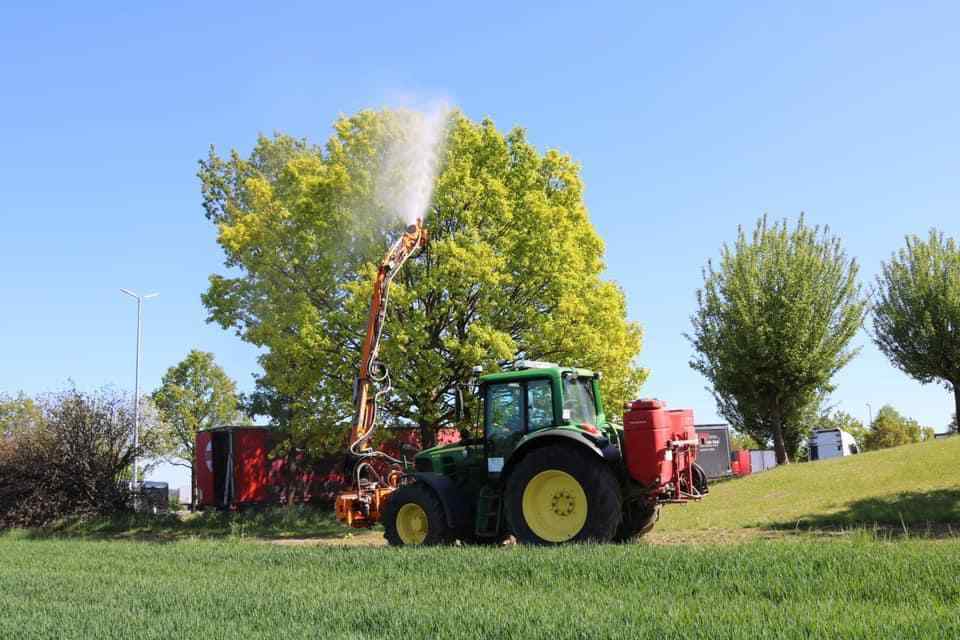 Mit diesem Sprühgebläse am Ausleger werden die Nematoden zusammen mit einer Trägerflüssigkeit in der Dämmerung zielgerecht auf die befallenen Bäume aufgetragen. Dieses ist kostengünstiger und arbeitsfreundlicher als Absaugen und kann mit vorhandener Mähtechnik und Personal erfolgen.